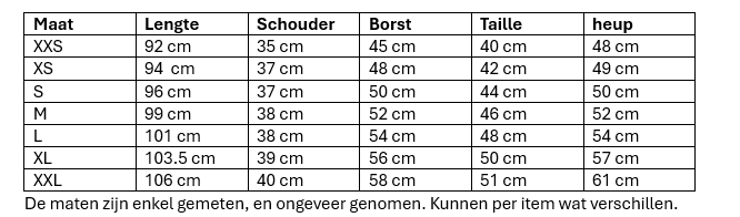 Jurk maat XXS-XXL. De jurken vallen ruim. Zit je tussen 2 maten in dan adviseren wij de kleinere maat.