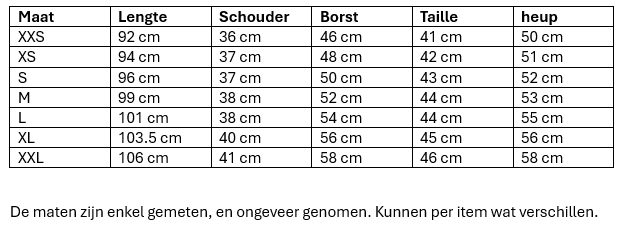Jurk maat XXS-XXL. De jurken vallen ruim. Zit je tussen 2 maten in dan adviseren wij de kleinere maat.